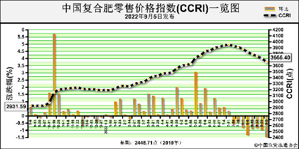 9月5日中國復合肥零售價格指數(CCRI)為3666.40點,環比下跌55.83點,跌幅為1.50%;同比上漲734.81點,漲幅為25.07%;比基期上漲1219.69點,漲幅為49.85%。