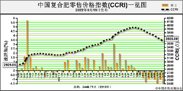 9月19日中國復合肥零售價格指數(CCRI)為3565.69點,環比下跌63.77點,跌幅為1.76%;同比上漲635.83點,漲幅為21.70%;比基期上漲1118.98點,漲幅為45.73%。