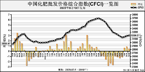 9月19日中國化肥批發價格綜合指數(CFCI)為3206.27點,環比上漲11.86點,漲幅為0.37%;同比上漲247.30點,漲幅為8.36%;比基期上漲827.43點,漲幅為34.78%。
